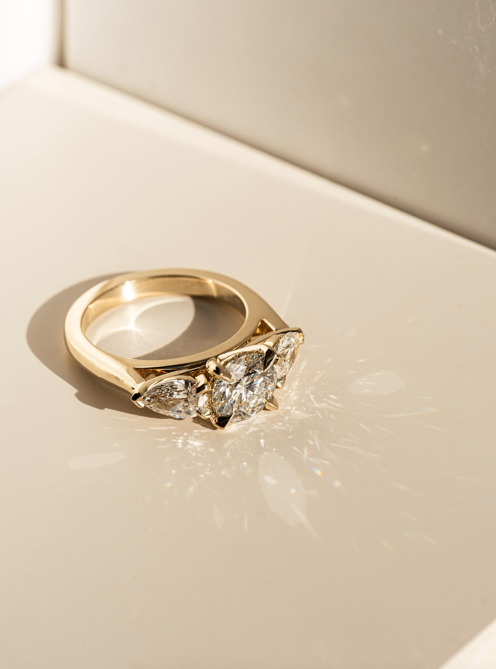 A favourite among many couples, the three-stone style represents your past, present and future together. It can be designed with any shape or combination of stones, and we’ll work closely with you to find the proportions and details that best suit.