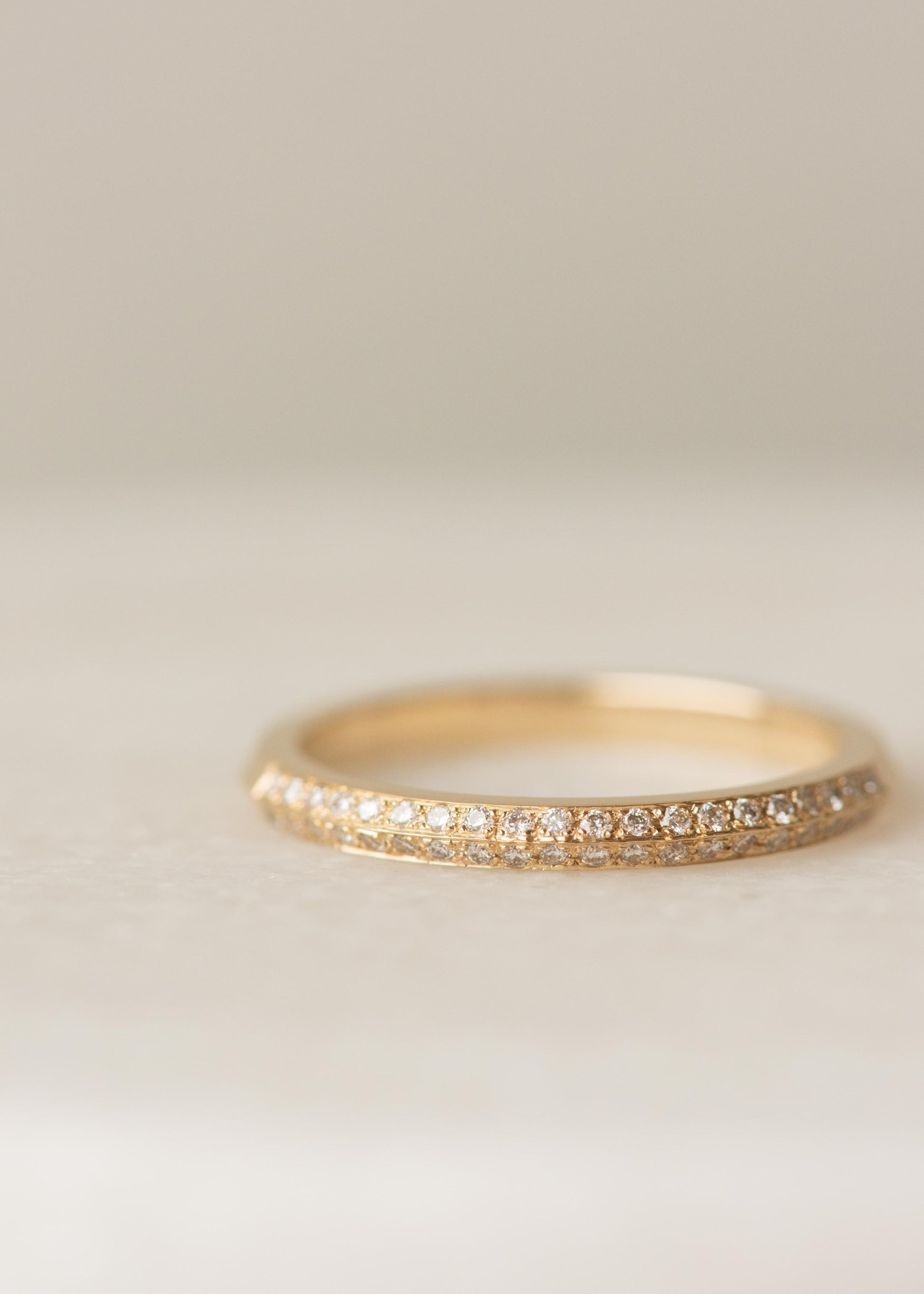 This elegant knife edge ring is encrusted with micro french pave set round brilliant cut diamonds. Available in any metal and finger size on request.
